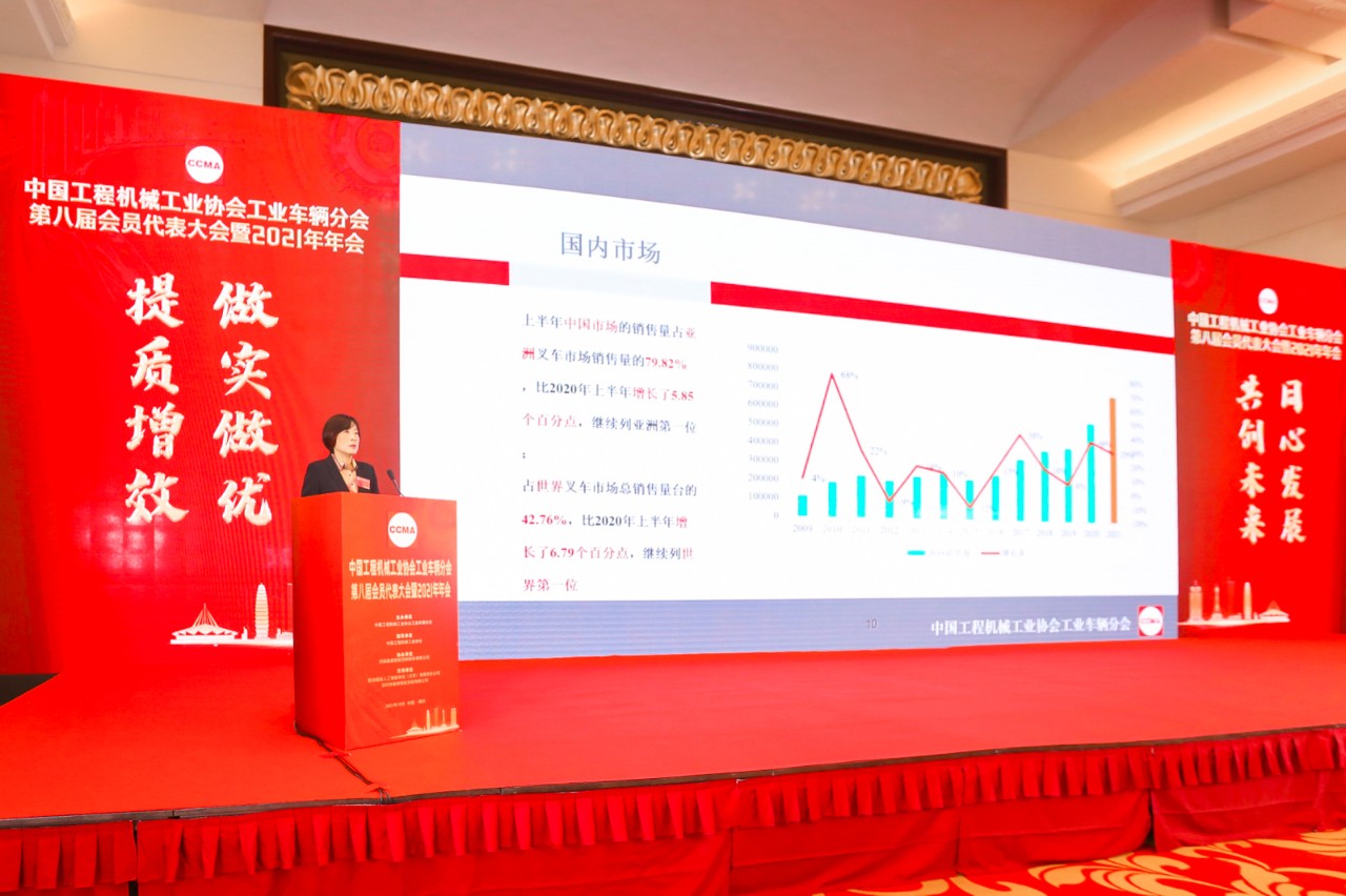 會上,中國工程機械工業協會工業車輛分會秘書長張潔就2021年度工業車輛行業市場概況進行了分享。2021上半年全球工業車輛行業總銷量達到994056臺,與2020年同期相比,增長了36.46%,中國市場得益于國家有效的防疫舉措,銷售達到425091臺,同比增長62.24%,表現亮眼。